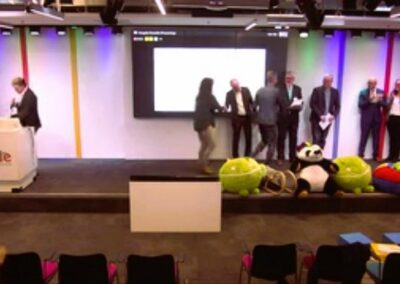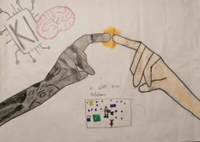 Prof. (em.) Dr. Laux, Leiter des Lehrstuhls für Persönlichkeitspsychologie und Psychologische Diagnostik der Universität Bamberg, mit dem Arbeits- und Forschungsschwerpunkt „Kreativität“ fiel besonders die Zugewandtheit auf, die die Kinder mit ihren Bildern zum Ausdruck bringen. Damit verdeutlichen die Bilder eine grundlegend positiv gestimmte Darstellung von KI, die u.a. in Form von zahlreichen, freundlich lächelnden Robotern auf den Werken zu entdecken ist.