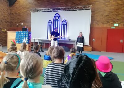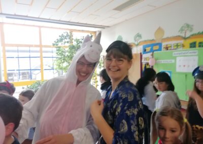 Alle Klassen waren zusammen in der Schulhauspolonaise unterwegs und tanzten ausgiebig zur Faschingschartliste in der Grundschulaula. Zwei Klassen besuchten unsere Kooperationspartner im Don-Bosco-Förderzentrum und erlebten Reiner Wenzel mit seinen handlungsorientierten musikalischen Darbietungen.