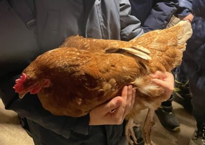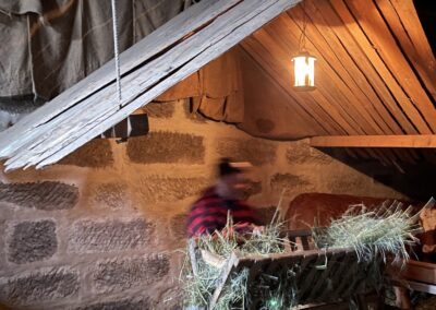 Auf dem Bauernhof tauchten wir in ein besonderes Weihnachtserlebnis ein. Inmitten einer Lebendkrippe mit Schafen, Ochs und Esel lauschten die Kinder auf die Geräusche im Stall. Leises Muhen und Blöken begleitete dabei die Weihnachtsgeschichte. Alle Tiere durften gestreichelt werden.